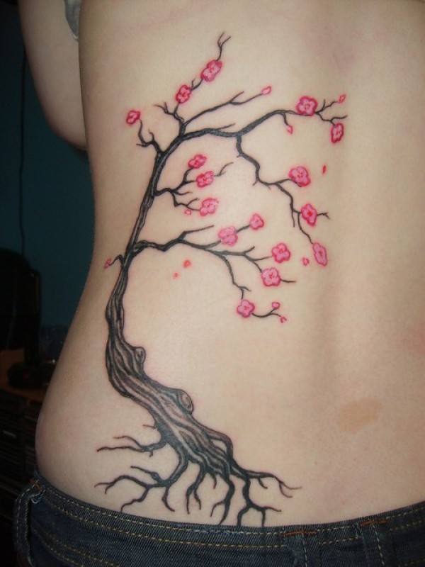 背部彩色的樱花树纹身图案