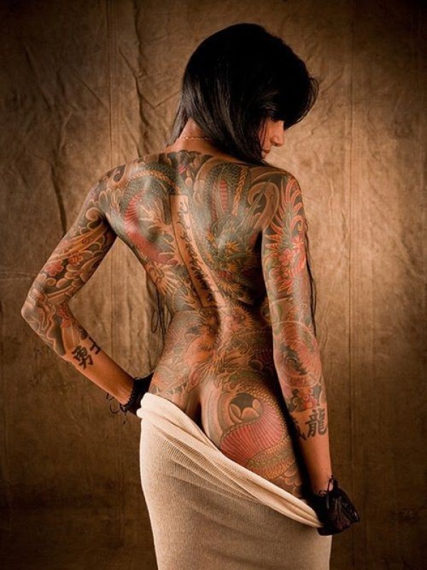 女性背部日式的龙纹身图案