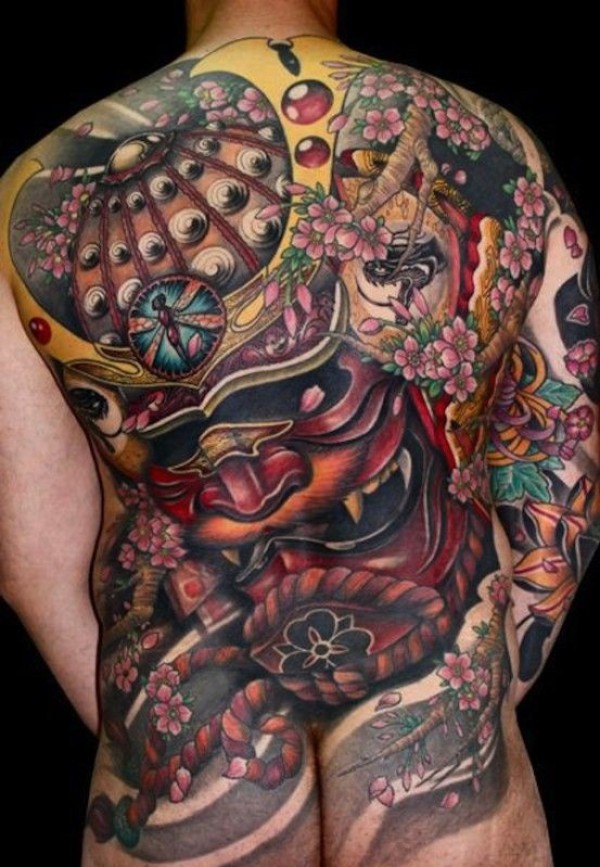 背部日本邪恶的恶魔樱花纹身图案