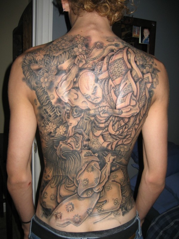 满背日式伟大的武士和恶魔纹身图案