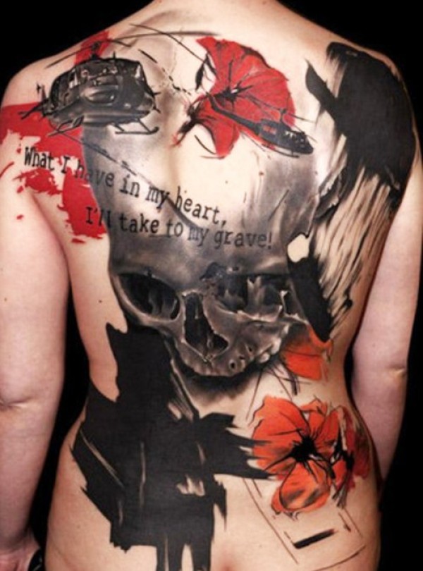 背部现代风格骷髅和花朵纹身图案