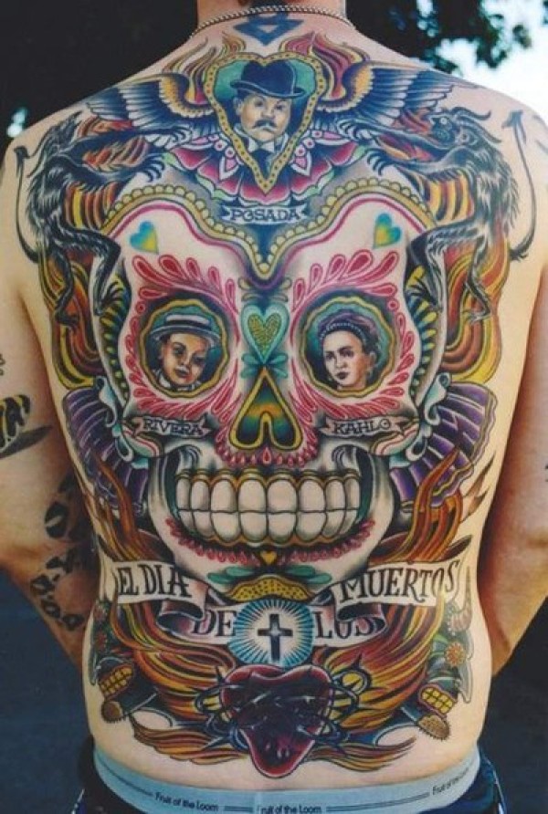 背部墨西哥彩色骷髅圣心纹身图案
