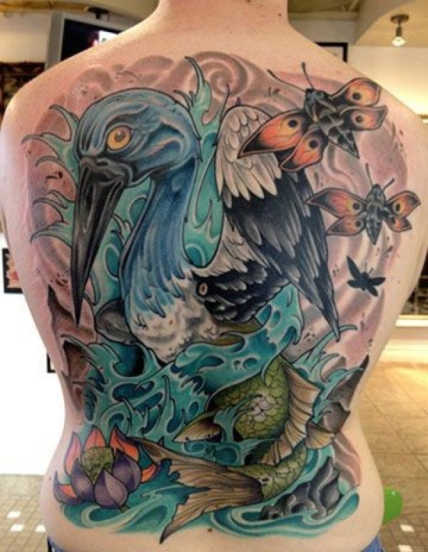 背部彩色的苍鹭鸟和蝴蝶纹身图案