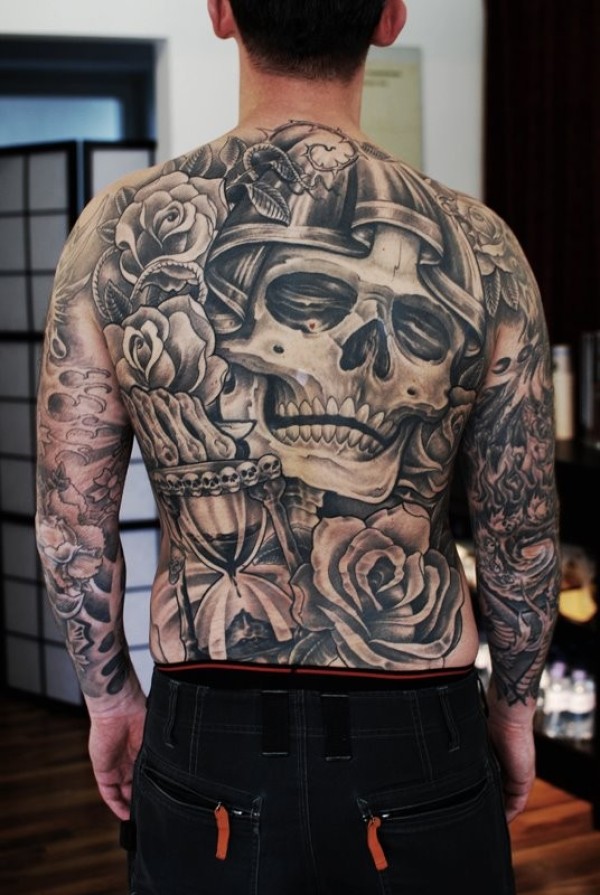 背部黑灰大骷髅和玫瑰纹身图案