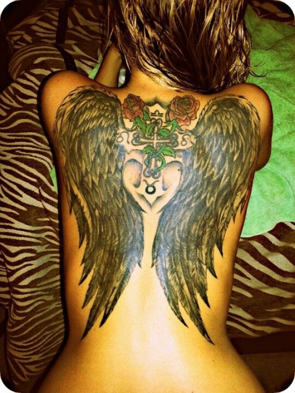 背部黑色的翅膀与红色的玫瑰纹身图案