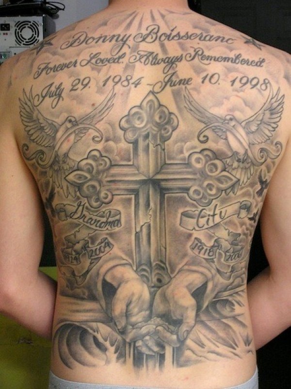 背部十字架鸽子字母纪念性纹身图案