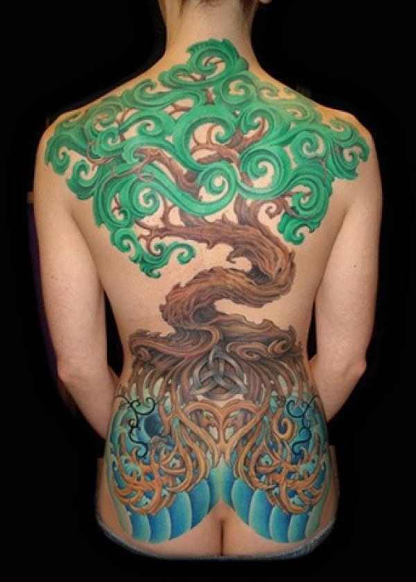背部象征性彩色大树纹身图案