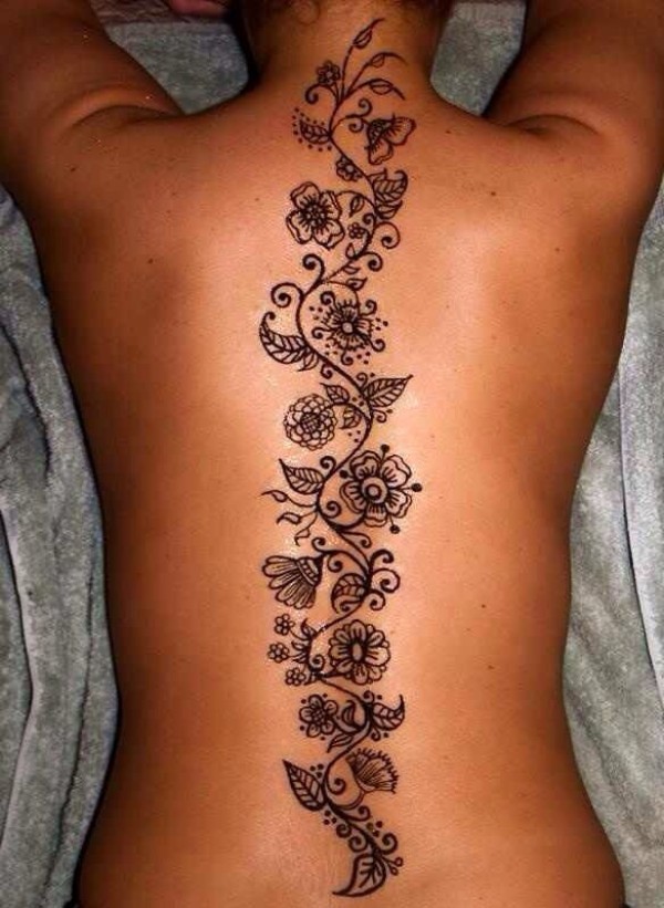 背部黑色的花卉藤蔓纹身图案