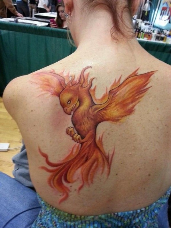 背部火红的凤凰纹身图案