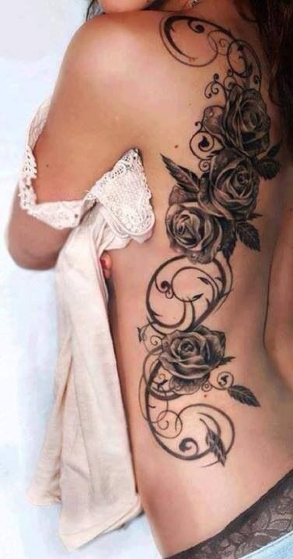 背部漂亮的黑灰玫瑰纹身图案