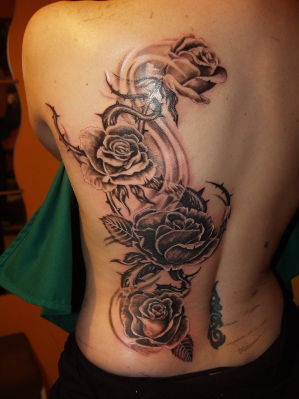 背部黑色好看的玫瑰纹身图案