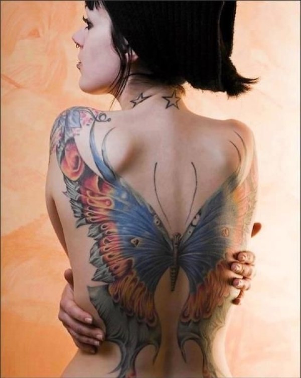 女生背部大蝴蝶彩绘纹身图案