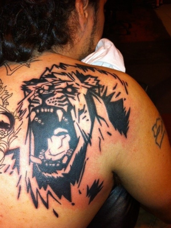 背部黑色咆哮的狮子卡通纹身图案
