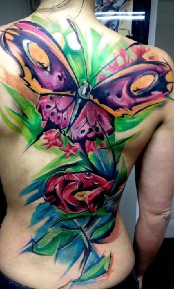 背部水彩花朵蝴蝶个性纹身图案