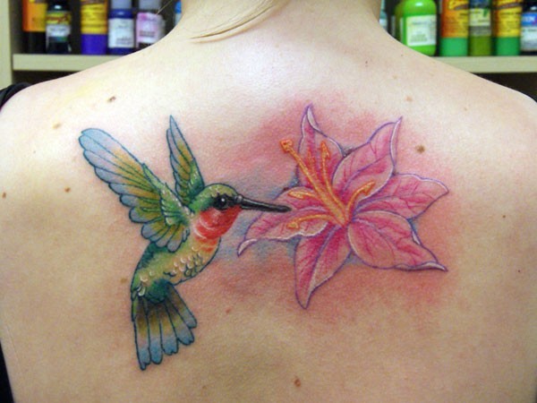 背部经典写实的蜂鸟花朵纹身图案