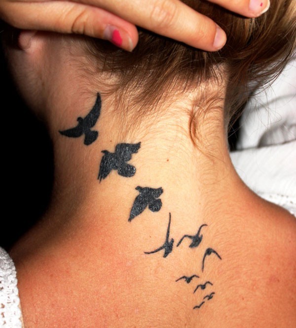 女生颈部一群黑色的鸟纹身图案
