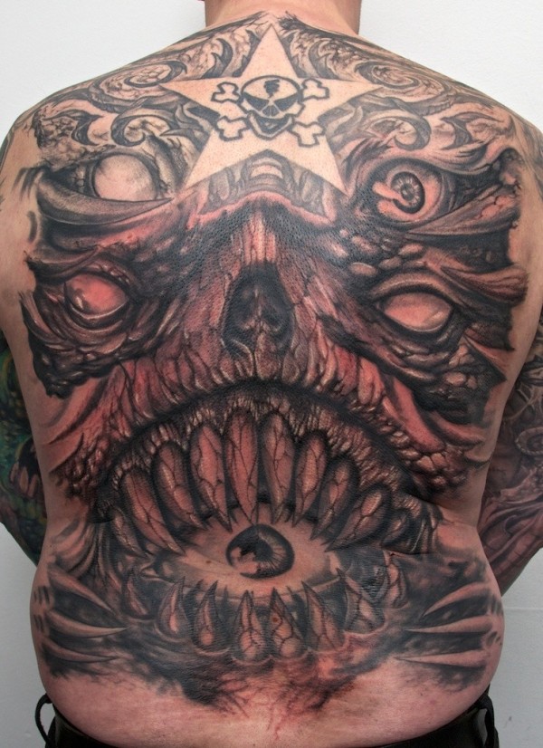 背部怪物魔鬼头像与眼球纹身图案