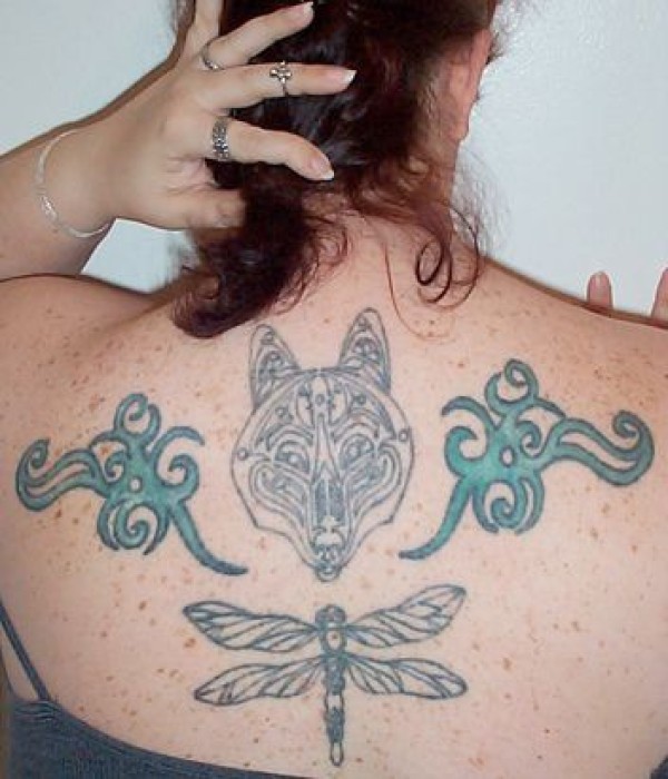 背部狼头与蓝色标志和蜻蜓纹身图案