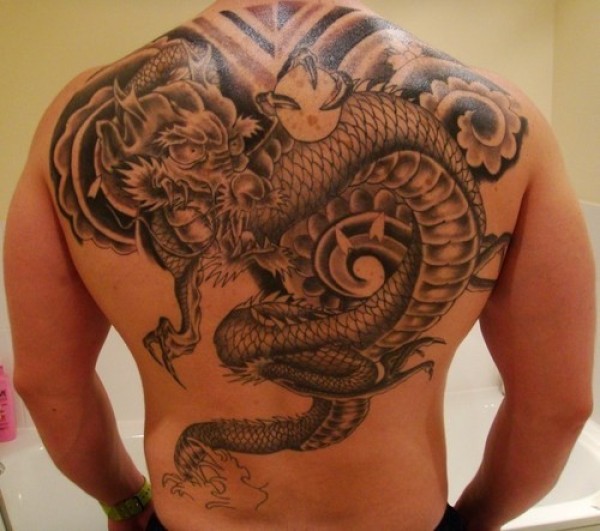 背部大型的龙和水晶球纹身图案