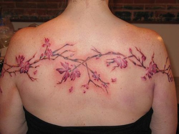 背部粉红色的花朵树枝纹身图案