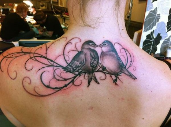 两只鸟与藤蔓背部纹身图案