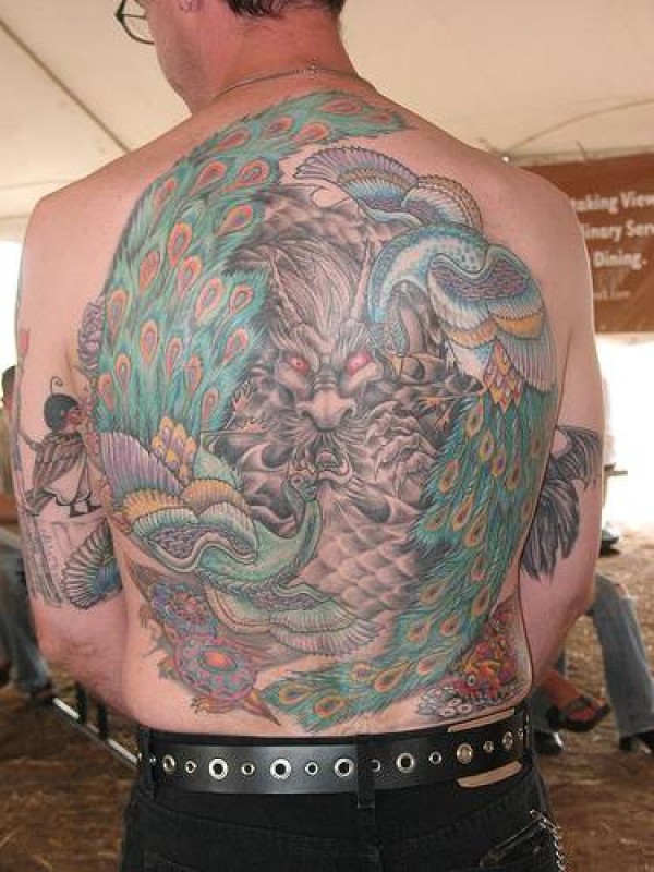 背部美丽的孔雀与龙纹身图案