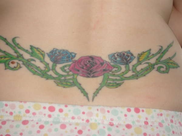腰部红色和蓝色的玫瑰藤蔓纹身图案