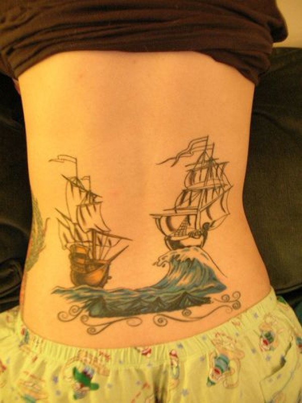 腰部两艘帆船在海浪上纹身图案