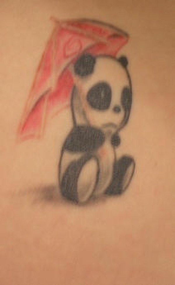 腰部悲伤的熊猫与红色雨伞纹身图案