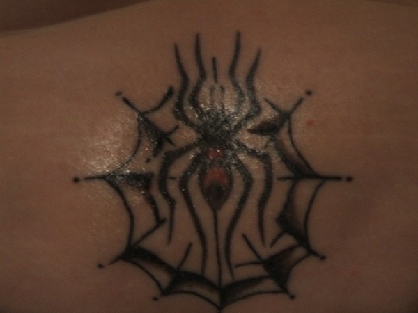 腰部黑色蜘蛛网与红蜘蛛纹身图案
