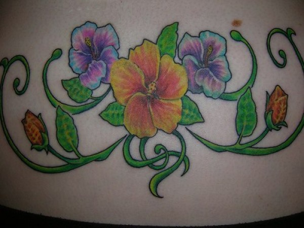 腰部黄色和紫色花朵纹身图案