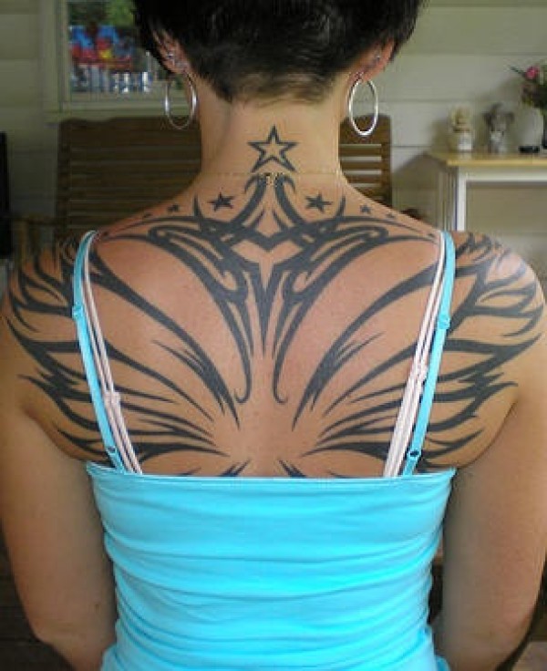背部黑色的翅膀图腾与星星纹身图案