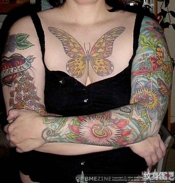 胸前的黄色大蝴蝶纹身