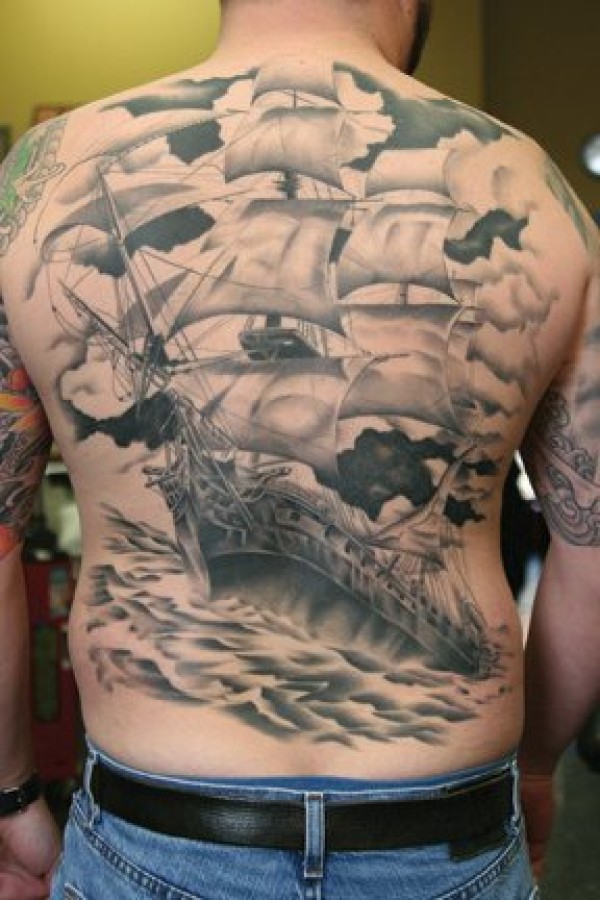 背部黑灰大型帆船与惊涛骇浪纹身图案