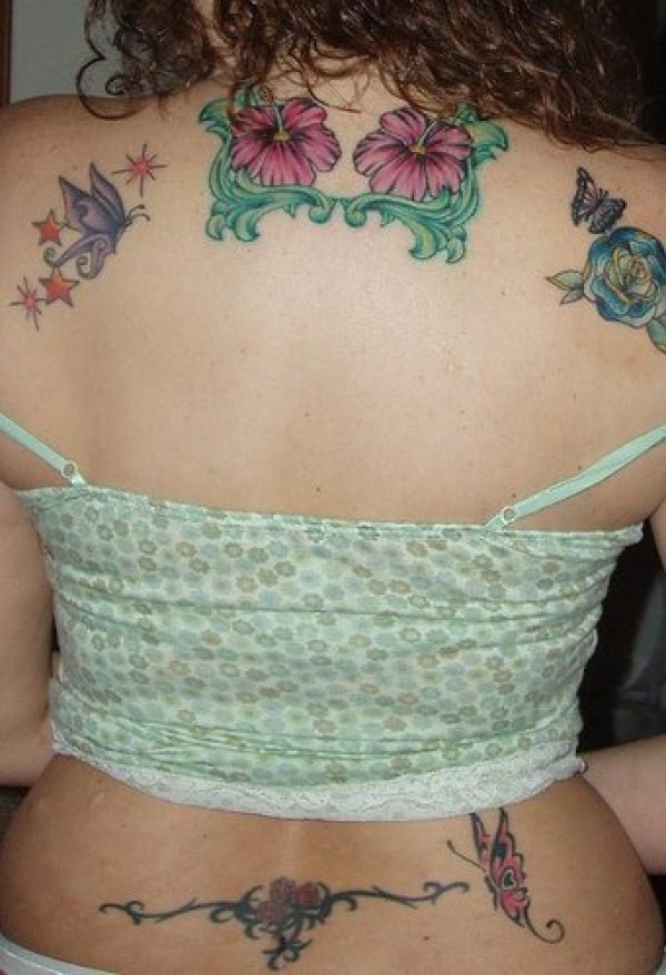 背部美丽的彩色花朵与蝴蝶纹身图案