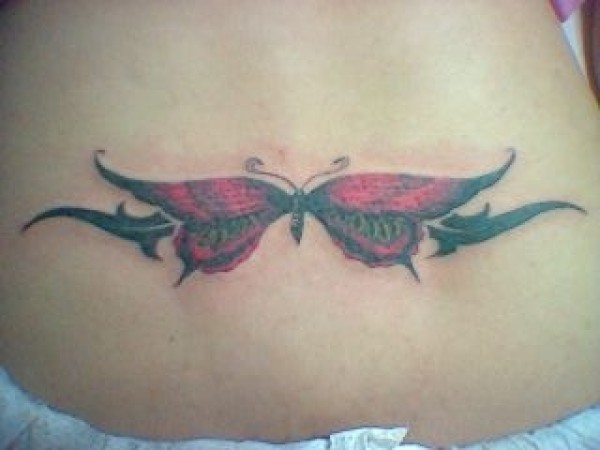 腰部扁平的黑色和红色蝴蝶纹身图案