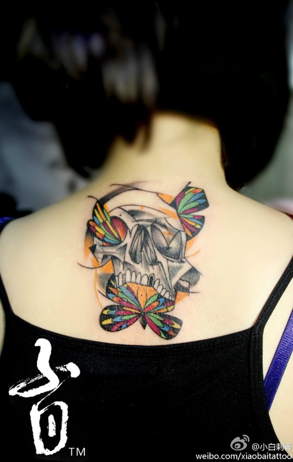 女生后背唯美时尚的小骷髅纹身图案