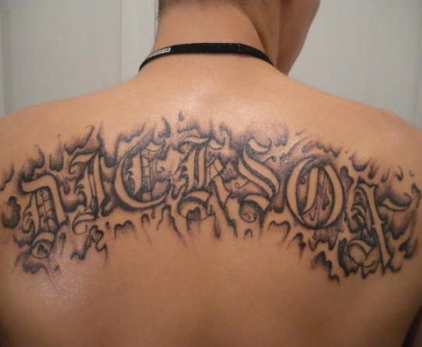 背部黑色的碑文字母纹身图案