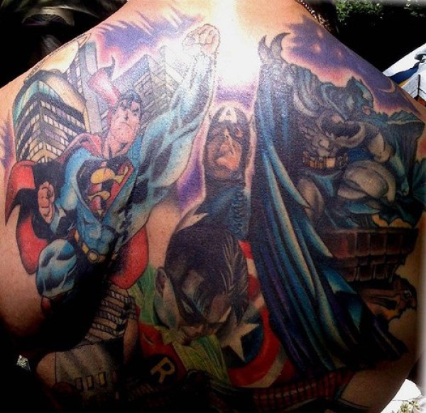 背部卡通彩绘蝙蝠侠与英雄纹身图案