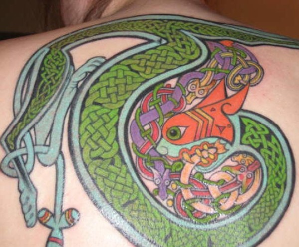 背部凯尔特风格大蛇吃小蛇纹身图案