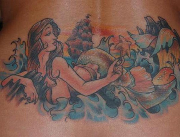 背部梦幻美人鱼与帆船纹身图案