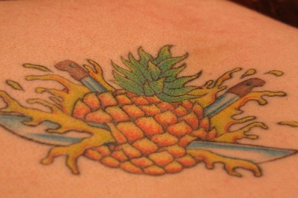 背部彩色的玻璃与匕首纹身图案