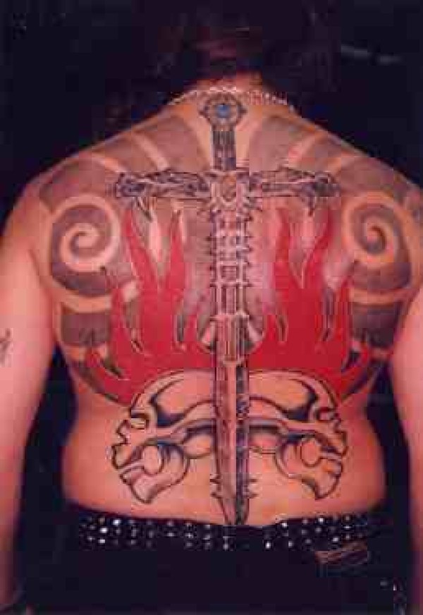 背部火焰和剑与骷髅纹身图案