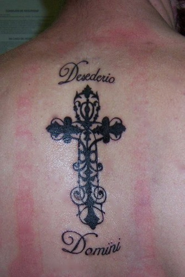 背部拉丁文与藤蔓十字架纹身图案