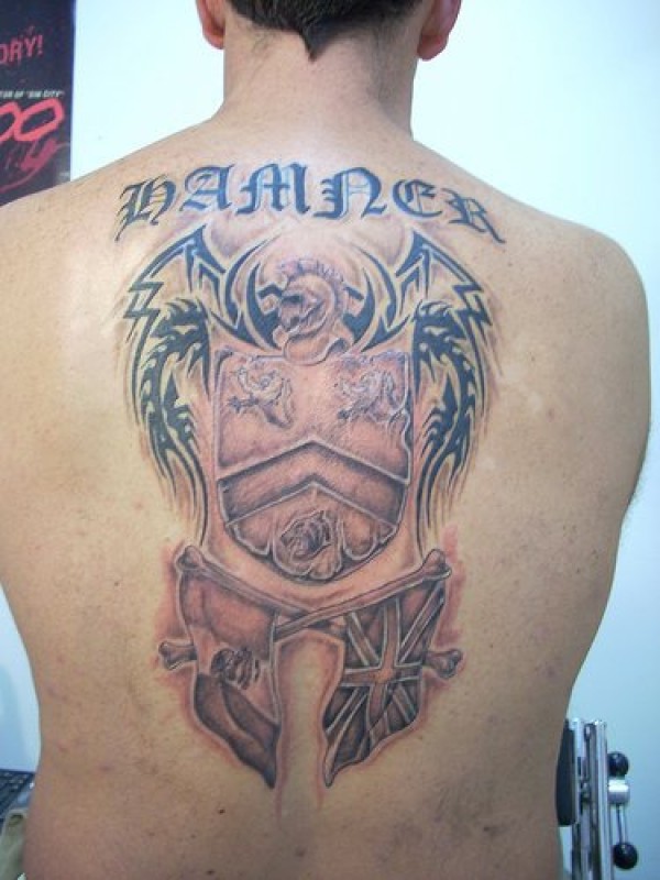 背部图腾徽章与字符纹身图案