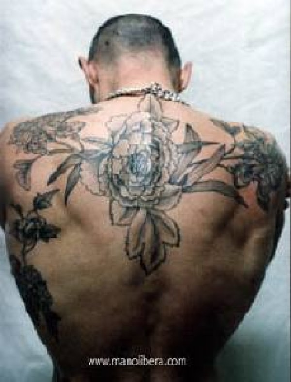 男性背部黑色的花朵纹身图案