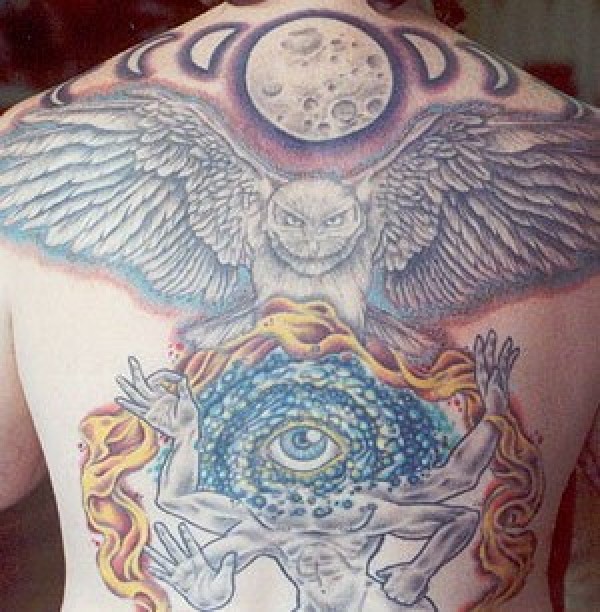 背部奇幻的眼睛与猫头鹰和月亮纹身图案