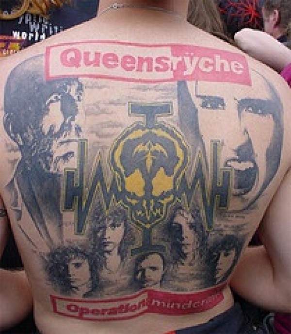 背部疯狂的人物肖像与字母纹身图案