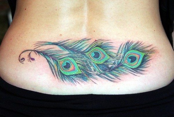 腰部漂亮的孔雀羽毛彩色纹身图案