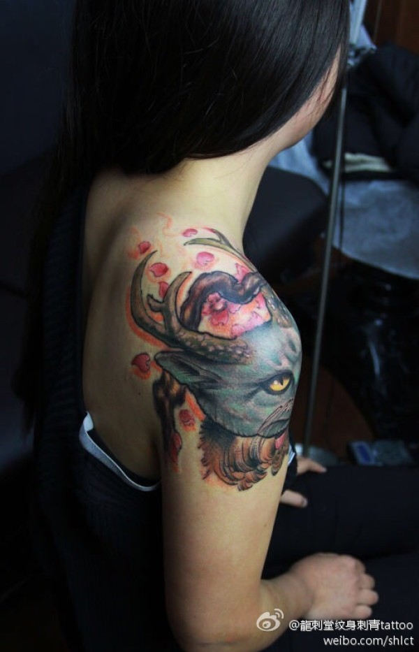 女生肩花纹身_15张女性双肩对称的肩花纹身图案作品图片